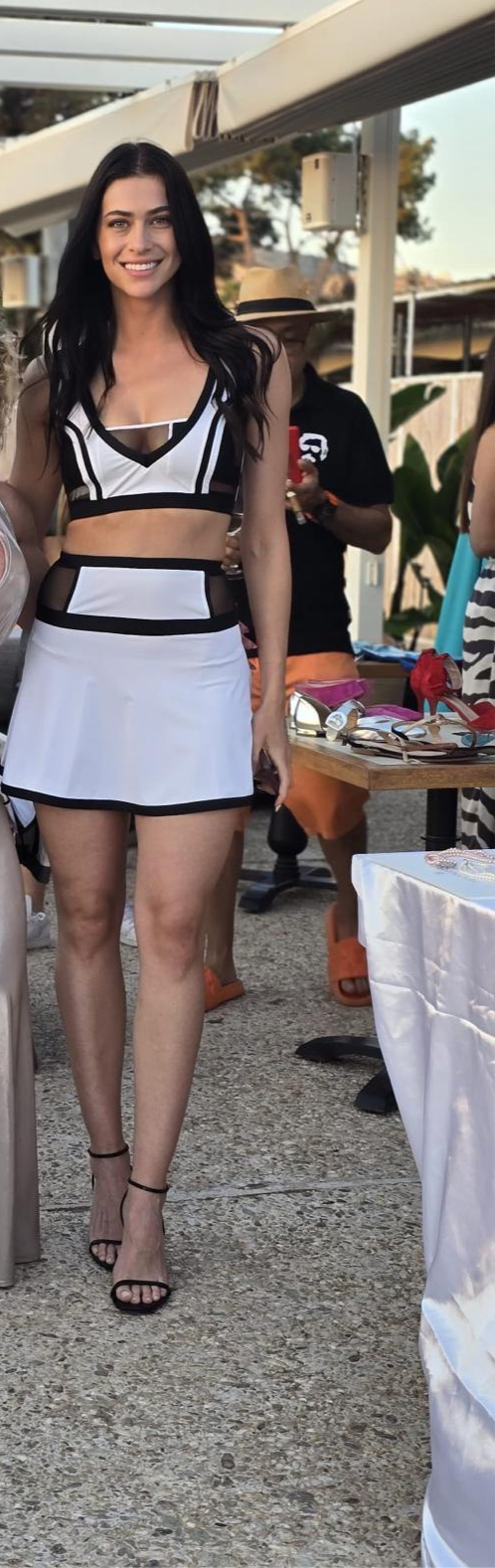 Two-piece Lycra set. The Binaco Top features a refined V-neck that enhances your figure, while the Black inner band with mesh inserts adds a touch of sensuality. Made of soft Lycra, this top offers a comfortable fit.